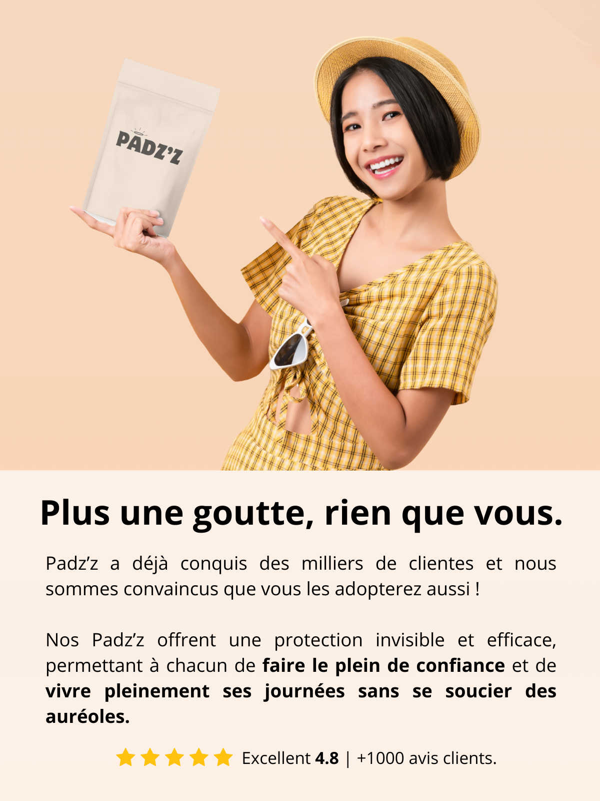 PADZ'Z vous protège des auréoles pendant toute la journée, selon votre niveau d'activité et de transpiration. Nous recommandons de le remplacer quotidiennement pour une hygiène optimale.